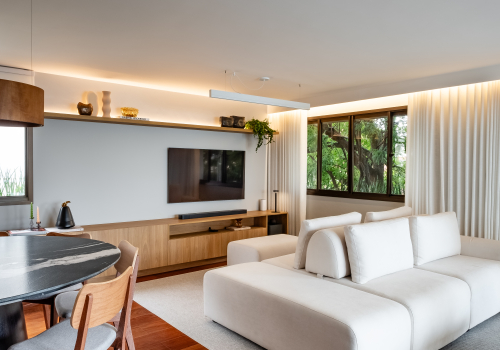 O pedido dos jovens clientes nesse projeto foi ter um apto clean e que pudessem receber os amigos e familiares com conforto pra isso, investimos na marcenaria e criamos um grande painel de madeira na sala de estar e sala de tv (detalhe para a porta camarão que fecha e abre conforme a necessidade dos moradores). O terraço também recebeu atenção especial, criamos o ponto para a churrasqueira à gás e projetamos espaços para todos os equipamentos que nos pediram (adega, cevejeira, cooktop, tv...). Esse projeto foi totalmente concluído em 10 meses de reforma.