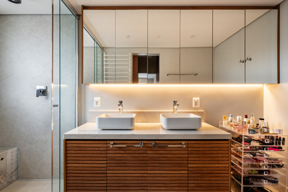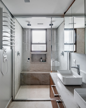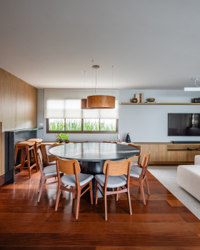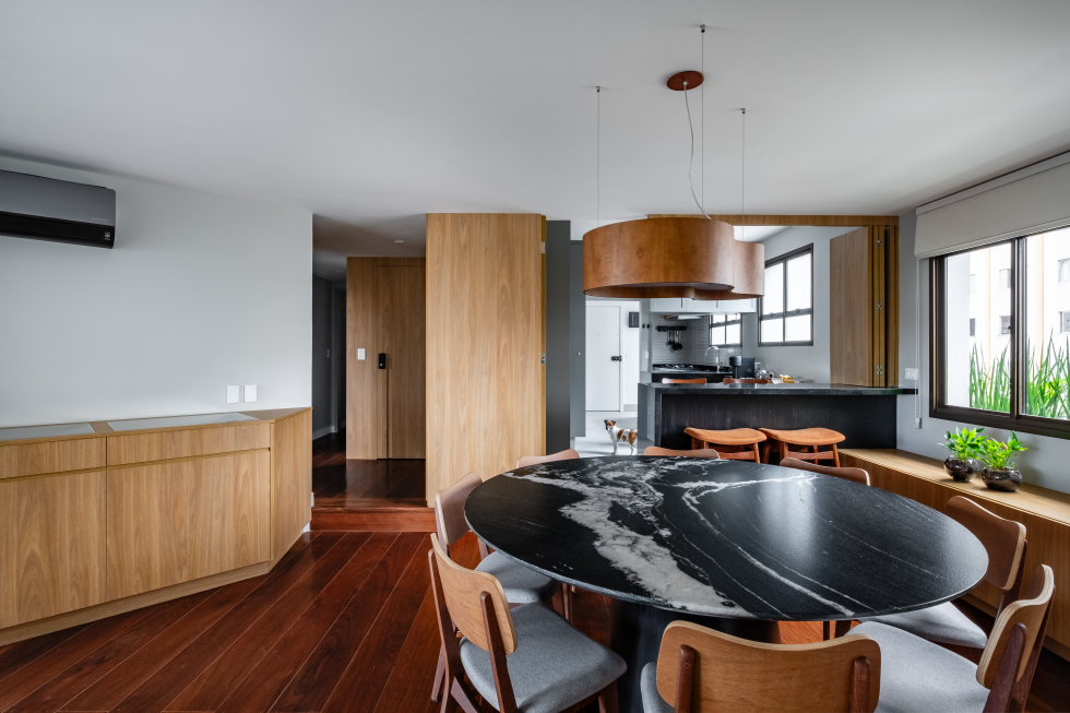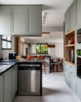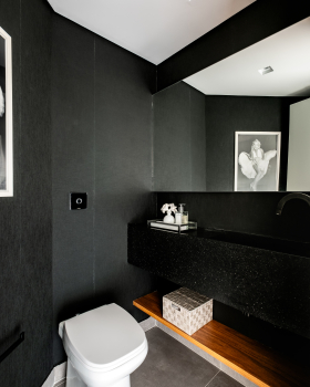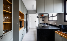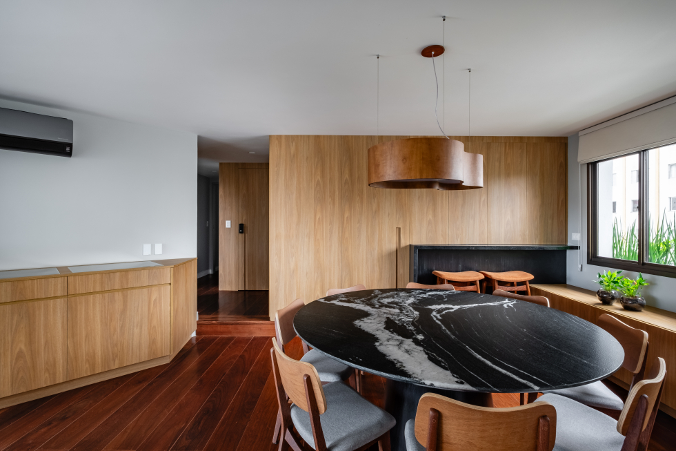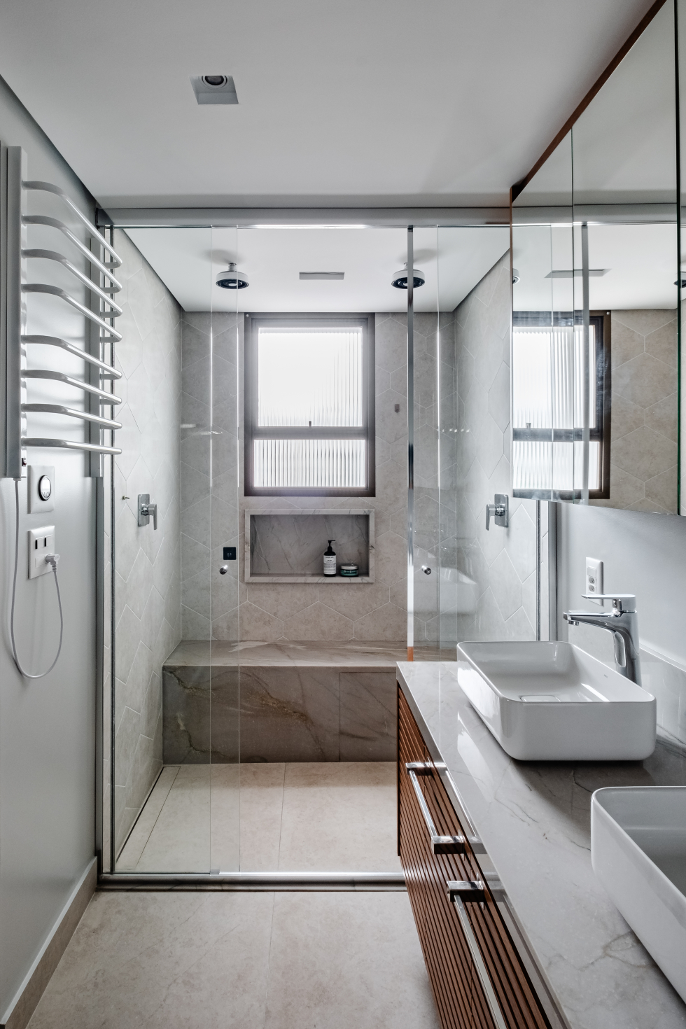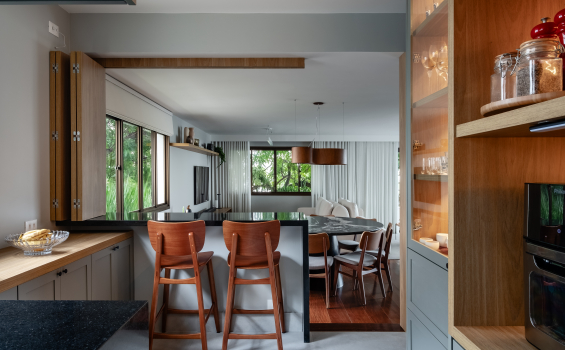 Esse projeto foi uma reforma completa: modifcamos todos os banheiros, atualizando acabamentos, layout e instalações. Criamos também um novo lavabo, integrado de forma estratégica à área social. A cozinha e a lavanderia passaram por uma remodelação completa: reconfiguramos os espaços, otimizamos a circulação e incorporamos soluções sob medida para atender às necessidades da família. Os ambientes ficaram mais integrados, funcionais e esteticamente coerentes com o restante do projeto.