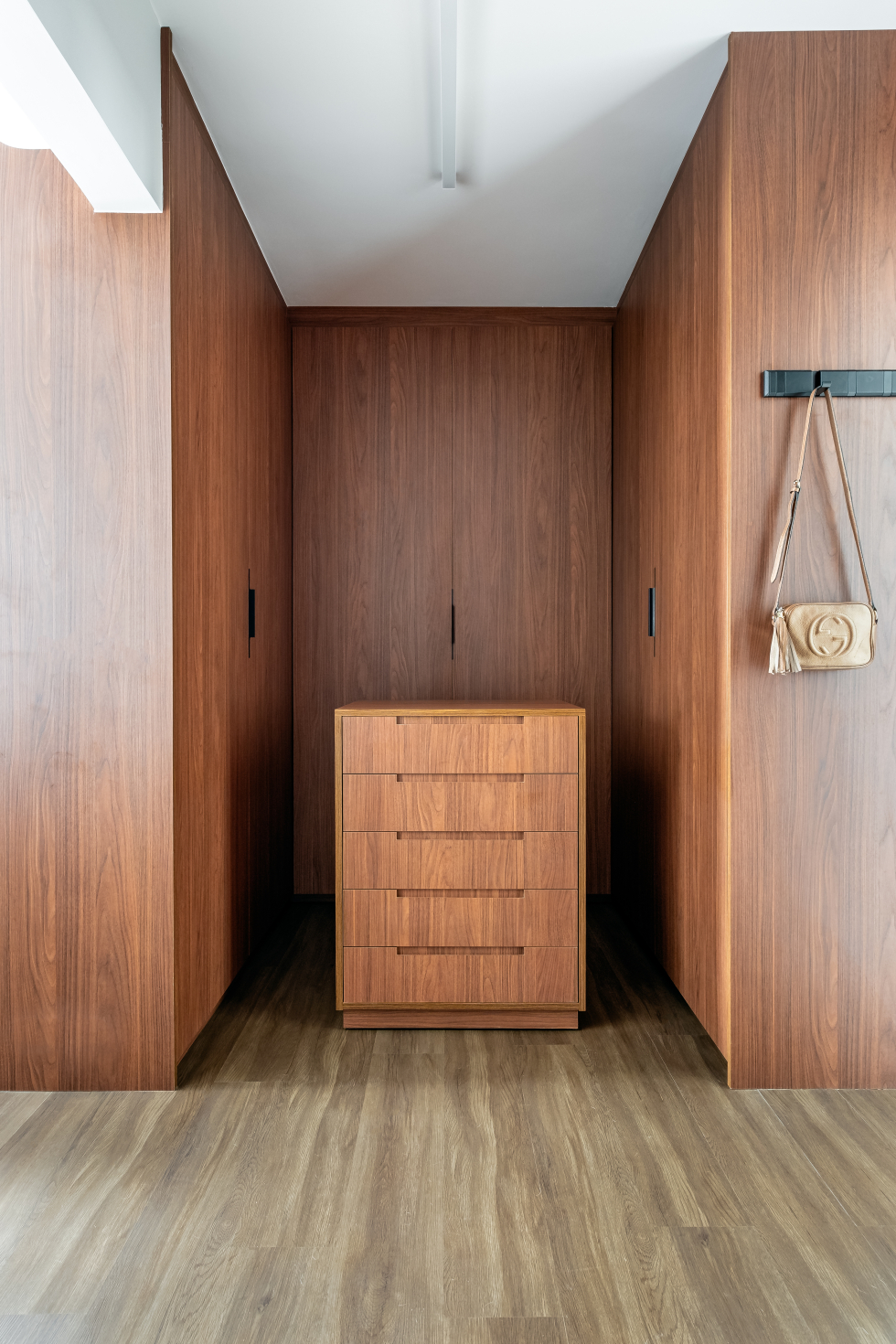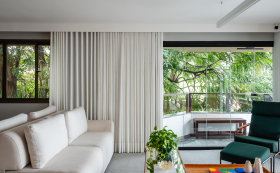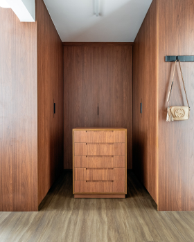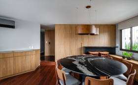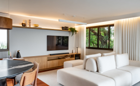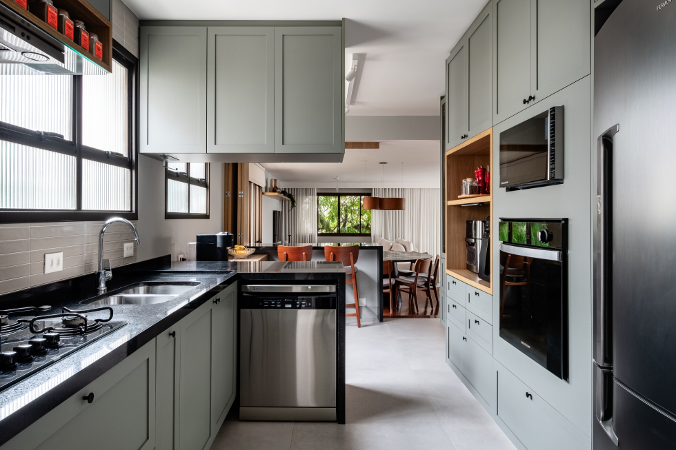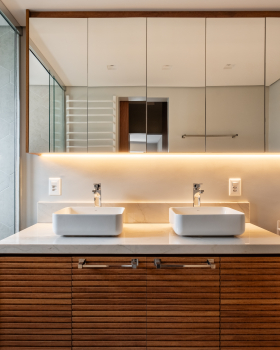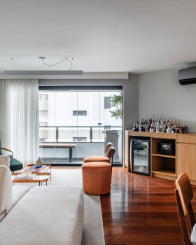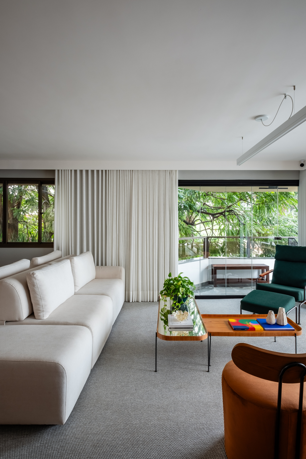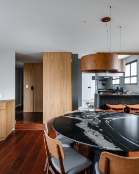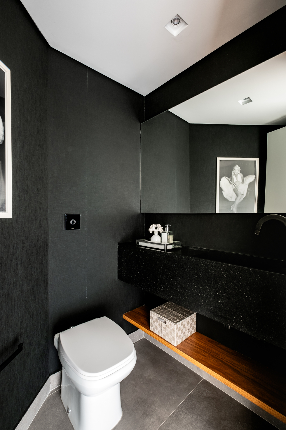 Esse projeto foi uma reforma completa: modifcamos todos os banheiros, atualizando acabamentos, layout e instalações. Criamos também um novo lavabo, integrado de forma estratégica à área social. A cozinha e a lavanderia passaram por uma remodelação completa: reconfiguramos os espaços, otimizamos a circulação e incorporamos soluções sob medida para atender às necessidades da família. Os ambientes ficaram mais integrados, funcionais e esteticamente coerentes com o restante do projeto.